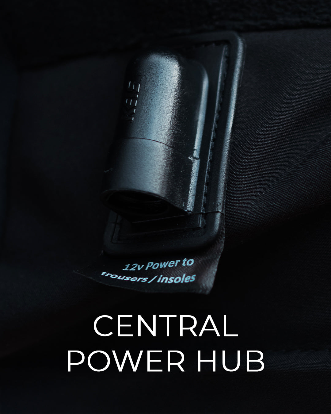 Central Power Hub: Got other KEIS kit? Connect your KEIS garments together using the included output sockets in the cuff of both arms and inside the waistband of any jacket, vest, or bodywarmer