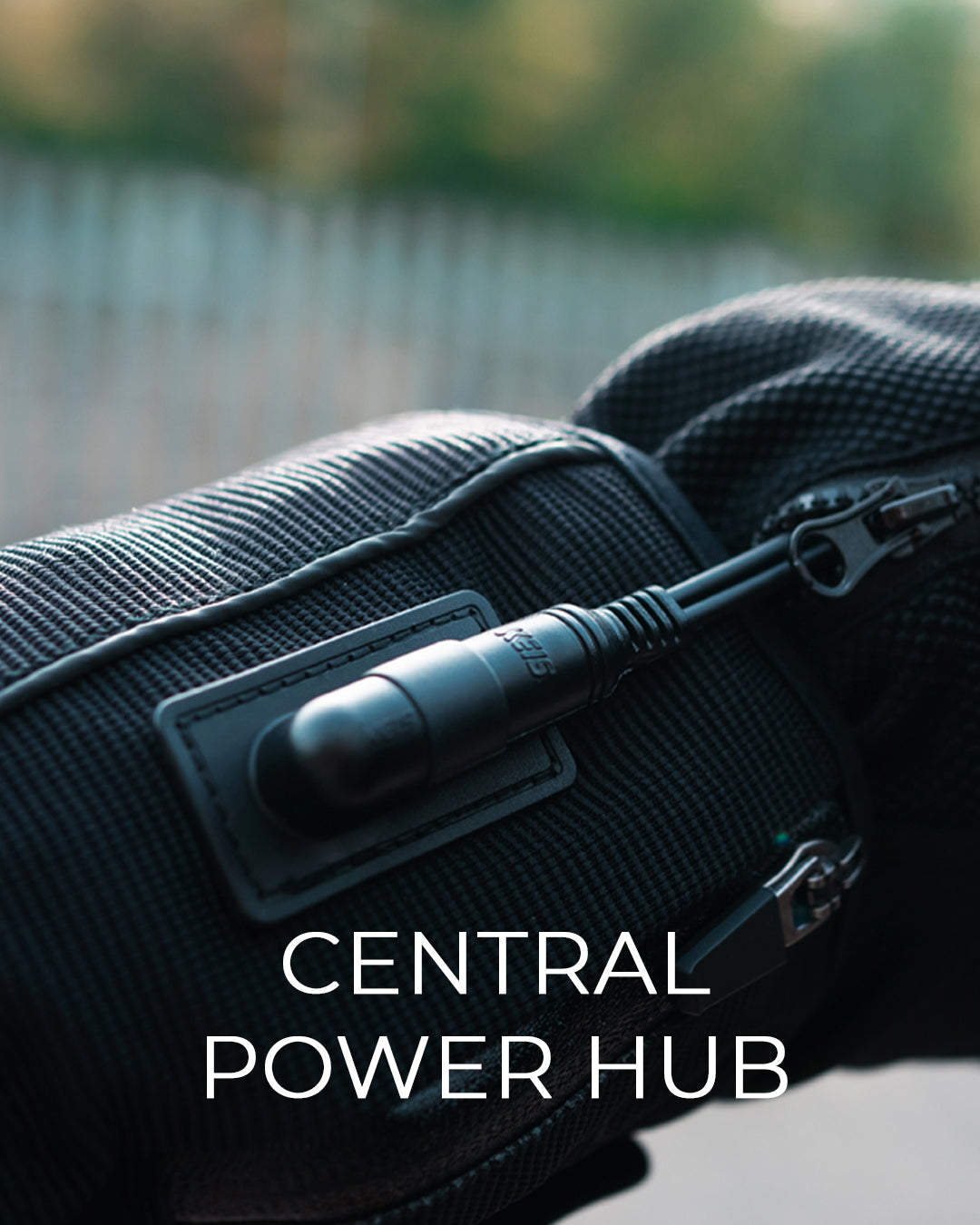 Central Power Hub : Vous possédez d'autres équipements KEIS ? Connectez vos vêtements KEIS entre eux grâce aux prises de sortie fournies, situées au niveau des poignets et à l'intérieur de la ceinture de n'importe quelle veste, gilet ou gilet sans manches.