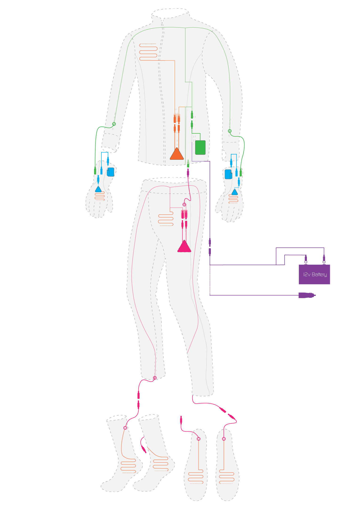 KEIS garments are all connected in a very similar way. Using leads and connectors, you can turn your Jacket, Vest or Bodywarmer into a central power hub for all other KEIS garments.