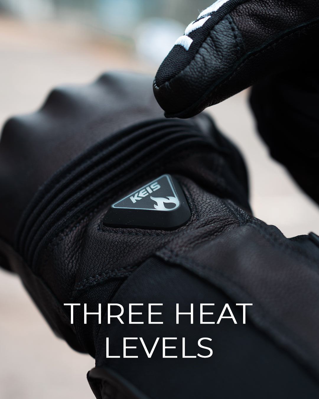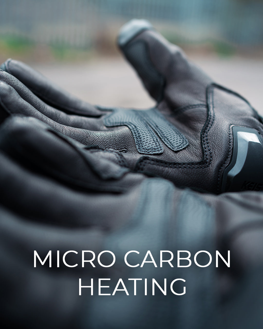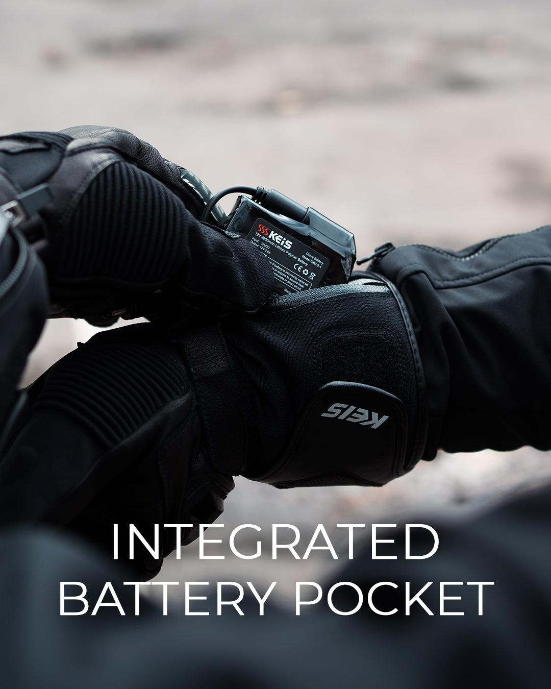 The KEIS G601 Heated Leather Touring Gloves are our best-selling motorcycle gloves, designed for exceptional control, dexterity, and long-distance comfort. Constructed from premium leather, they feature flexible hard armour, a scaphoid guard, and a visor wipe for wet weather practicality. Integrated Micro Carbon Fibre heating panels run across the backs of the hands and fingers, delivering even Far Infrared warmth where it matters most. An independent heat controller on the wrist allows on-the-fly adjustments, while 3M Thinsulate insulation maintains warmth even without power. Built-in battery pockets enable portable KEIS battery use, while a 12V vehicle supply provides unlimited on-bike heat. Includes: G601 Heated Gloves (pair), 12V Vehicle Supply Lead, instructions.